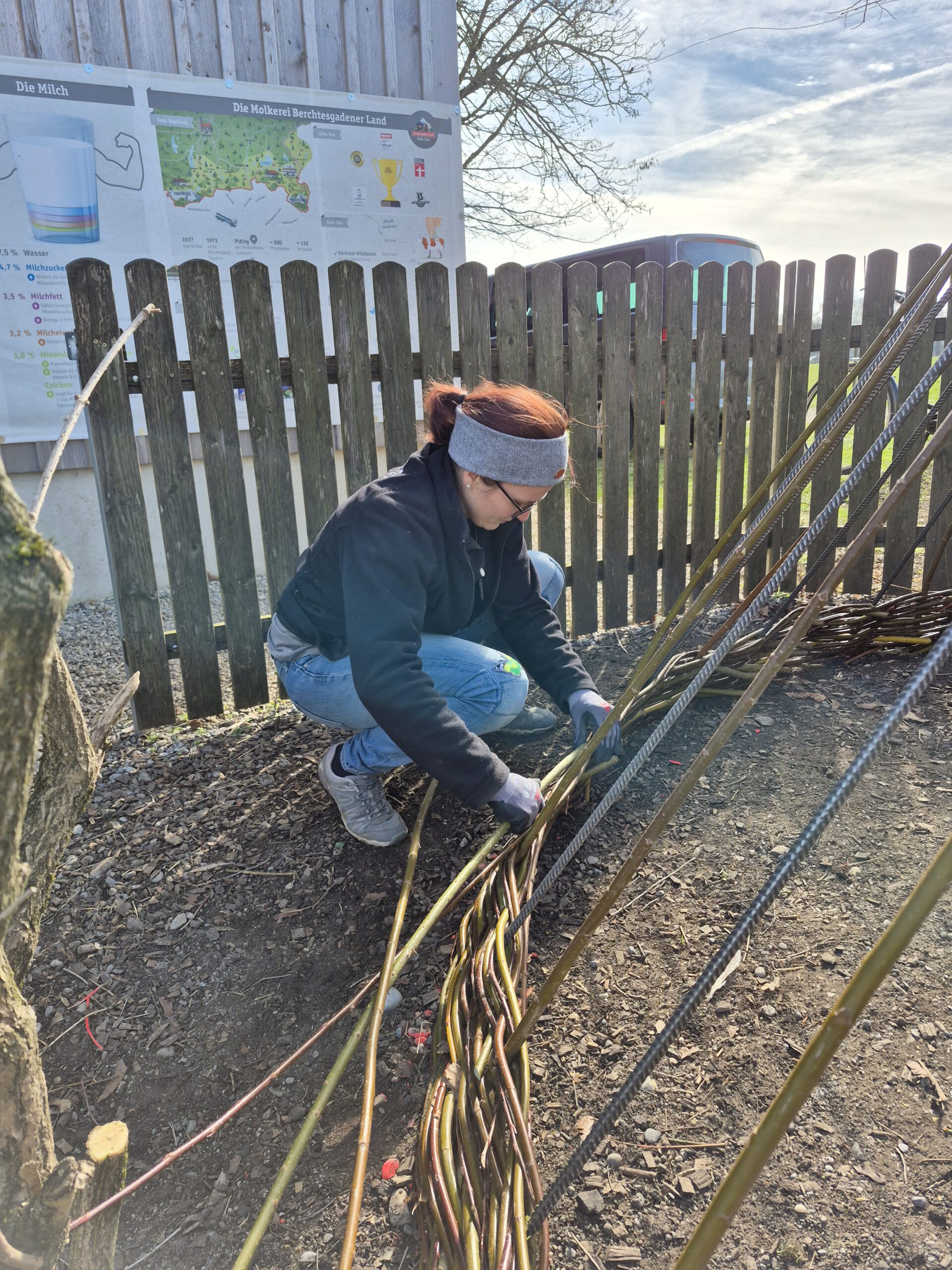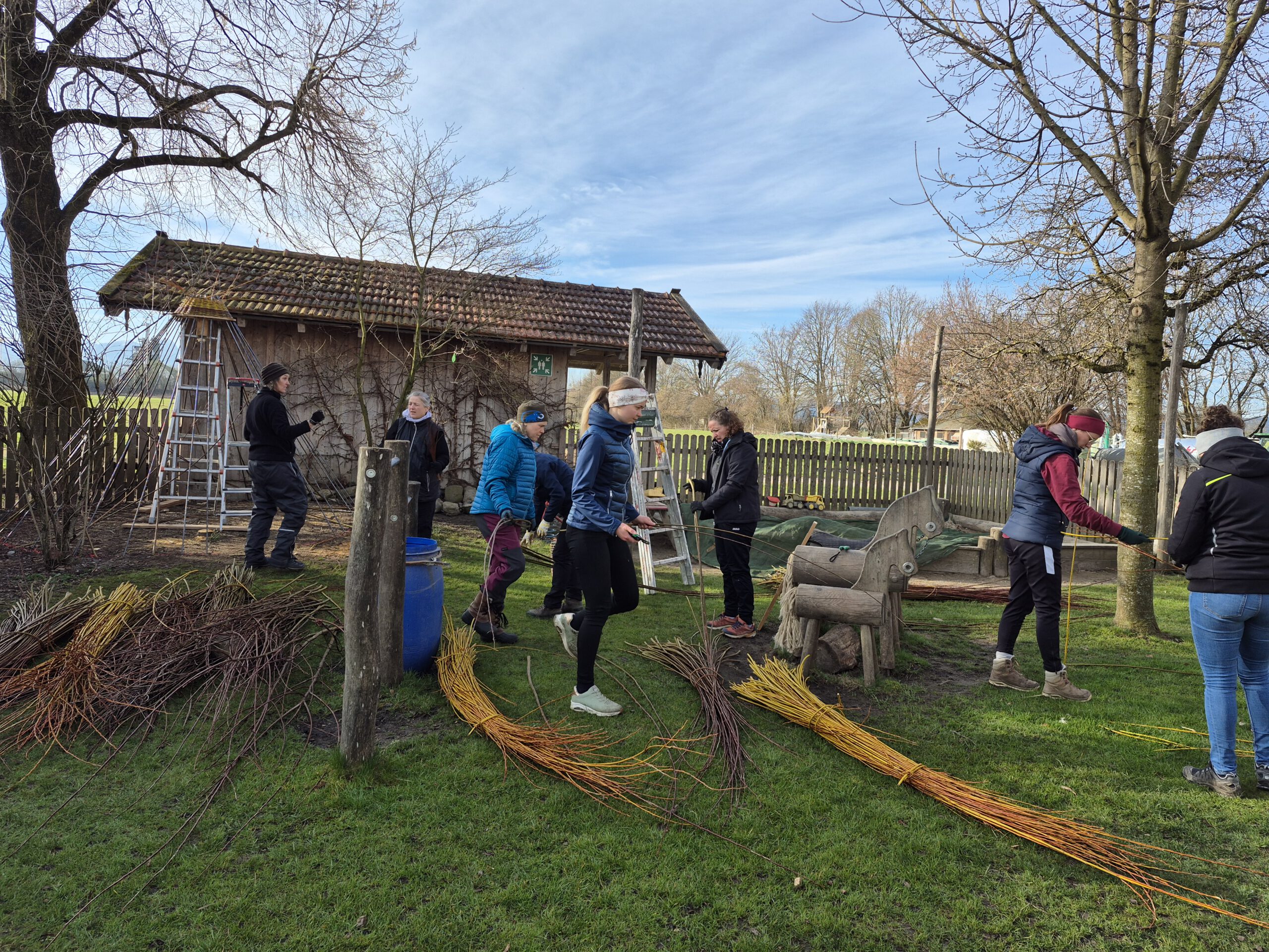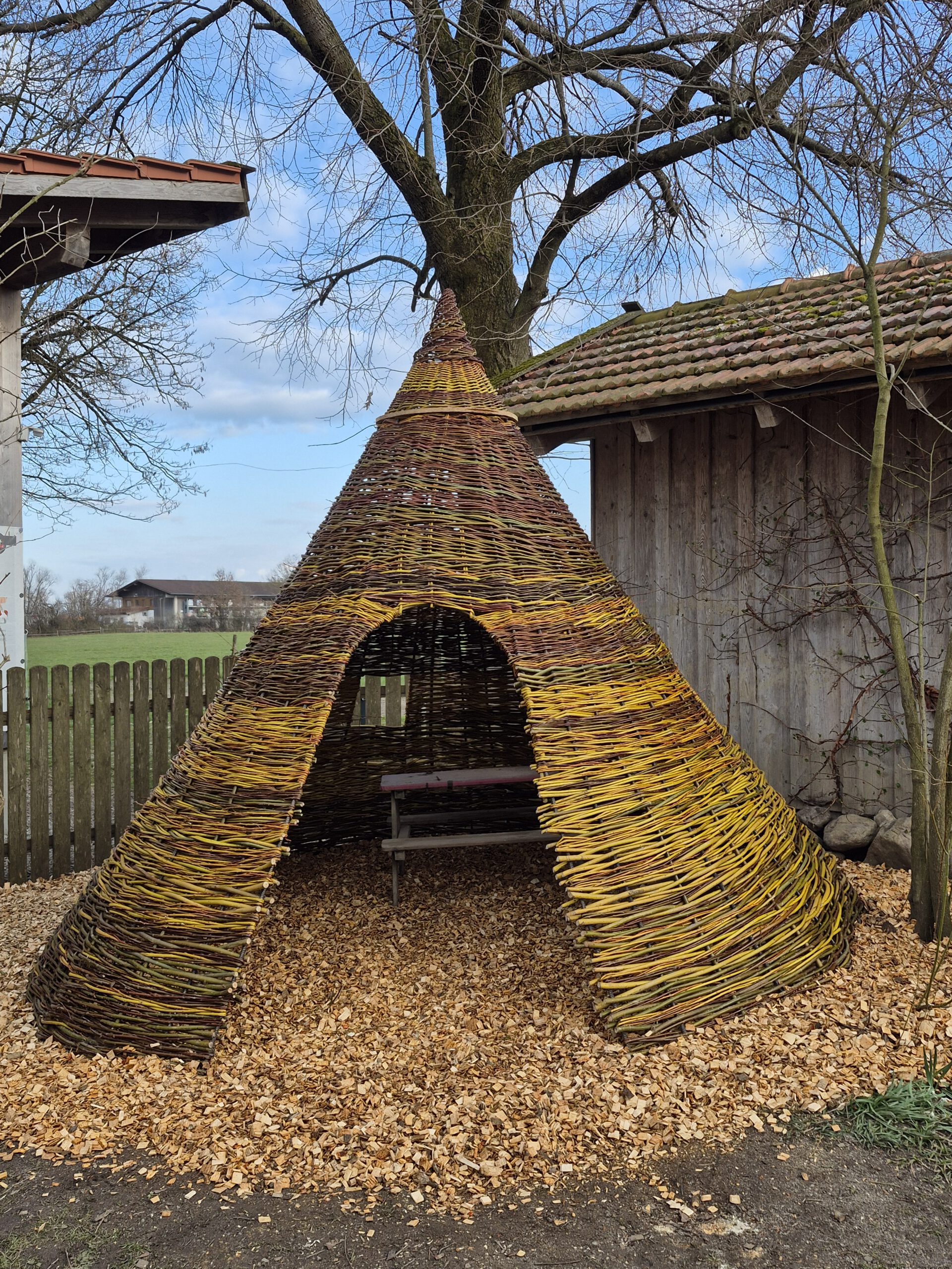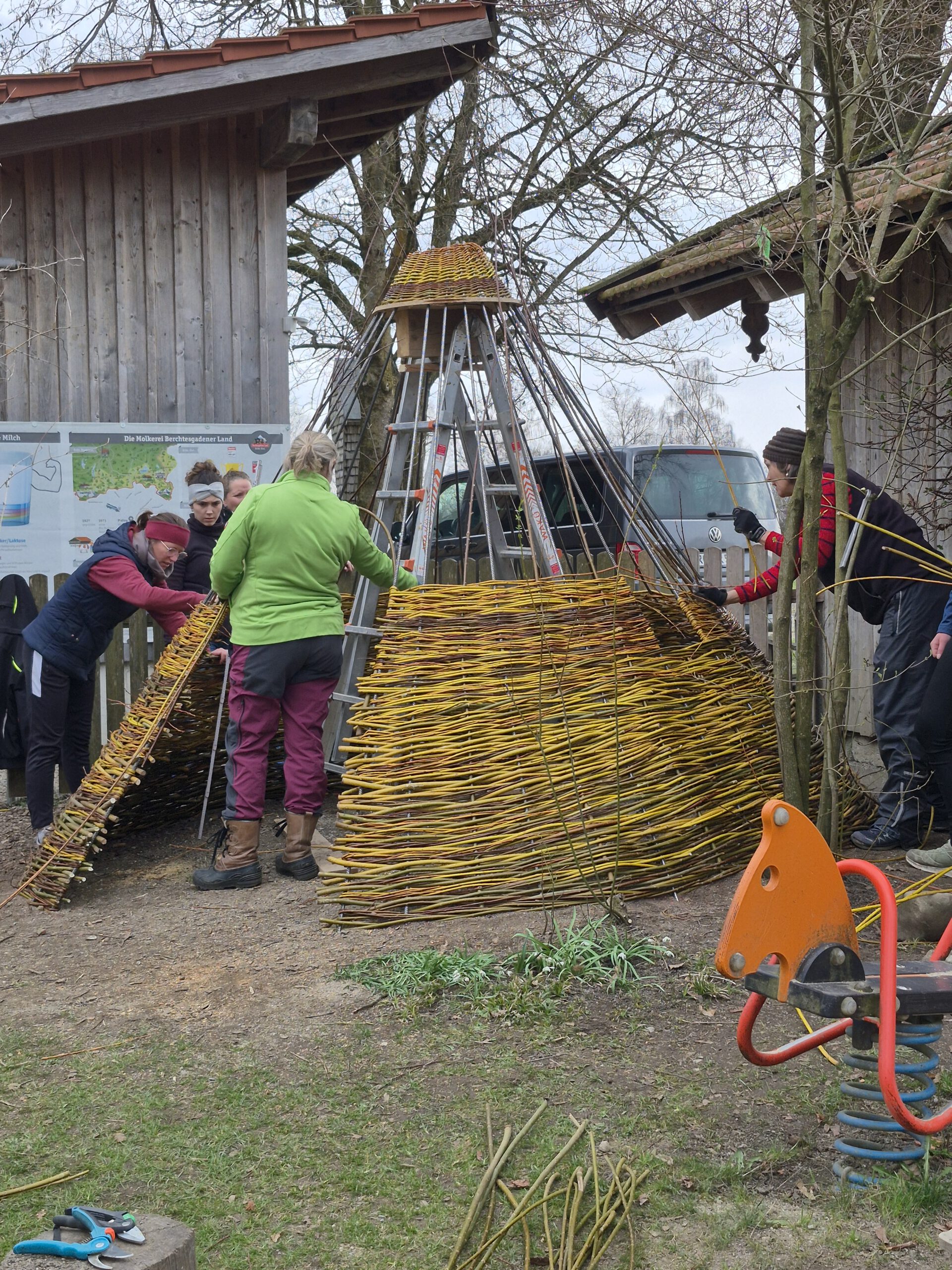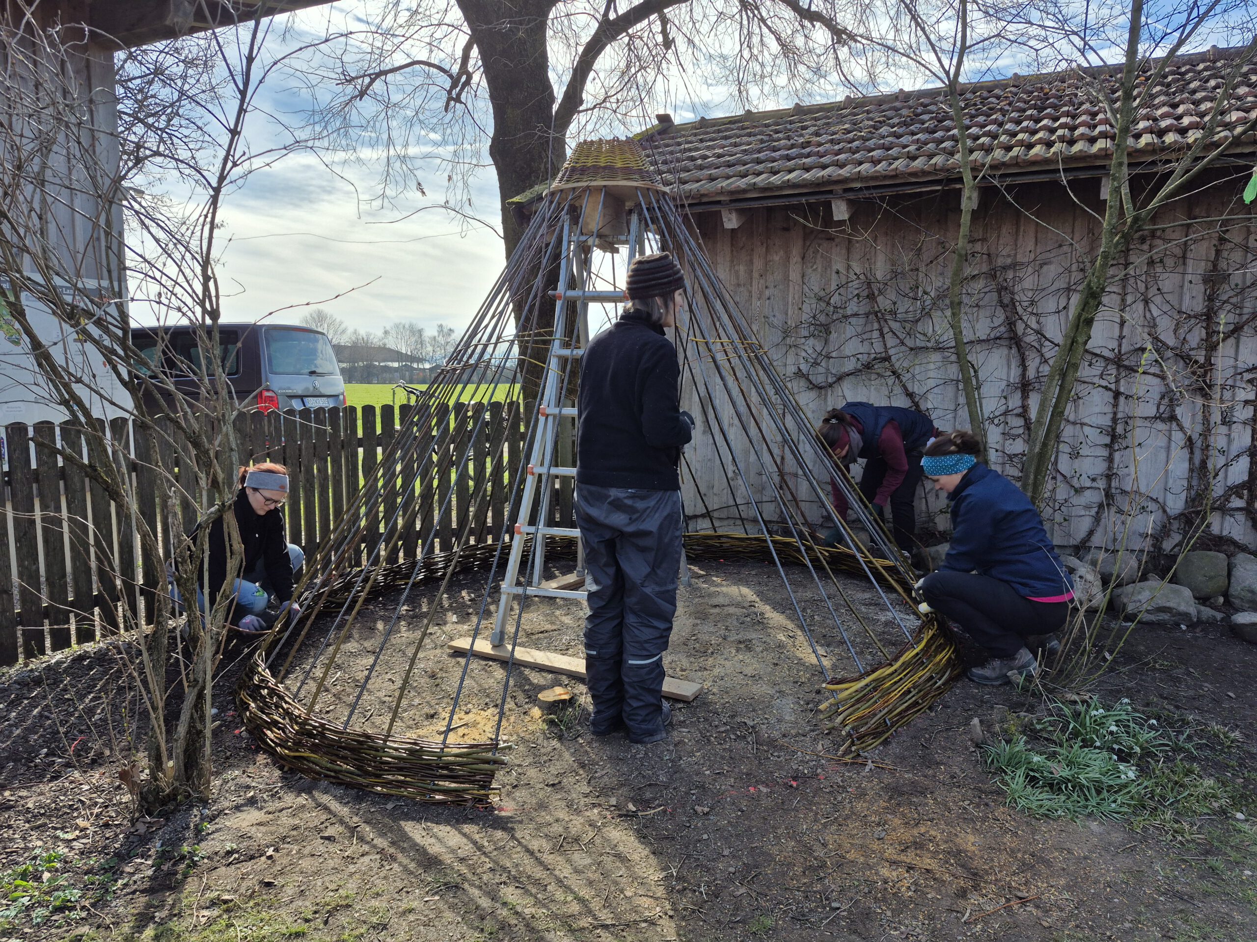 Am 25.3 schließt der Kindergarten für die Kindergartenkinder seine Türen und öffent sie für das Personal und Christine Krabichler. Gemeinsam mit der Weltmeisterin im Weidenpflechten verbringt das Team vom Bauernhof den Tag. Als erstes werden die einzelnen Weiden nach Stärke und Länge sortiert. Danach legen wir mit Christine los und pflechten die Weiden in das Drahtgerüst, dass ihr Mann extra für unsere Kinder gefertigt hat. Wir hatten es wahrlich unterschätzt, dass wir einen ganzen Tag für das Tipi benötigen. Aber am Ende ist es wunderschön mit den kleinen Fenstern und den unterschiedlichen Farben der Weide geworden! Ein großes Vergelt´s Gott an Christine Krabichler und Ihren Mann für das großartige Tipi!!